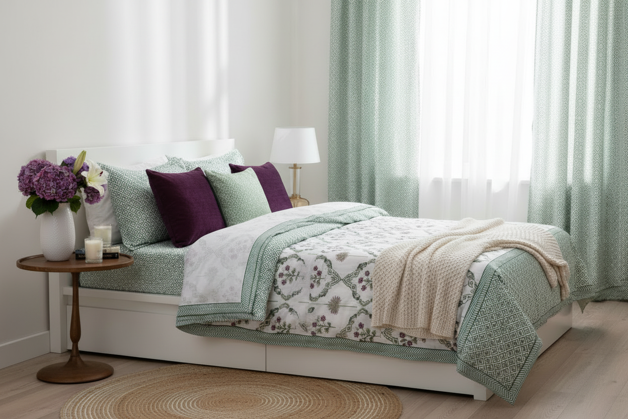 Soft breathable cotton bedsheets with elegant hand block prints and motifs inspired by heritage artistry, designed for calm, modern homes.